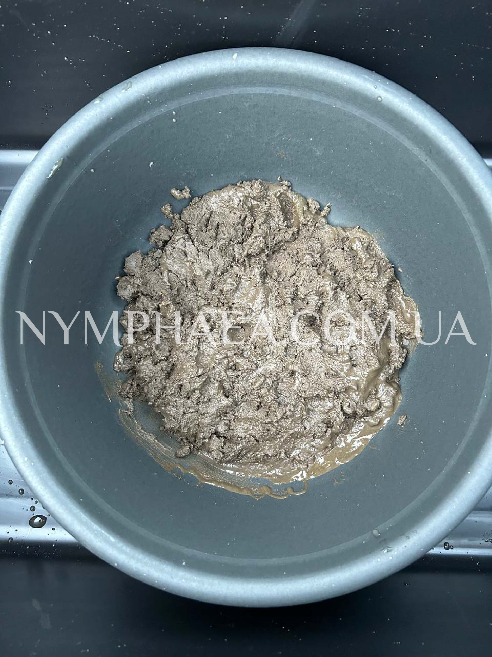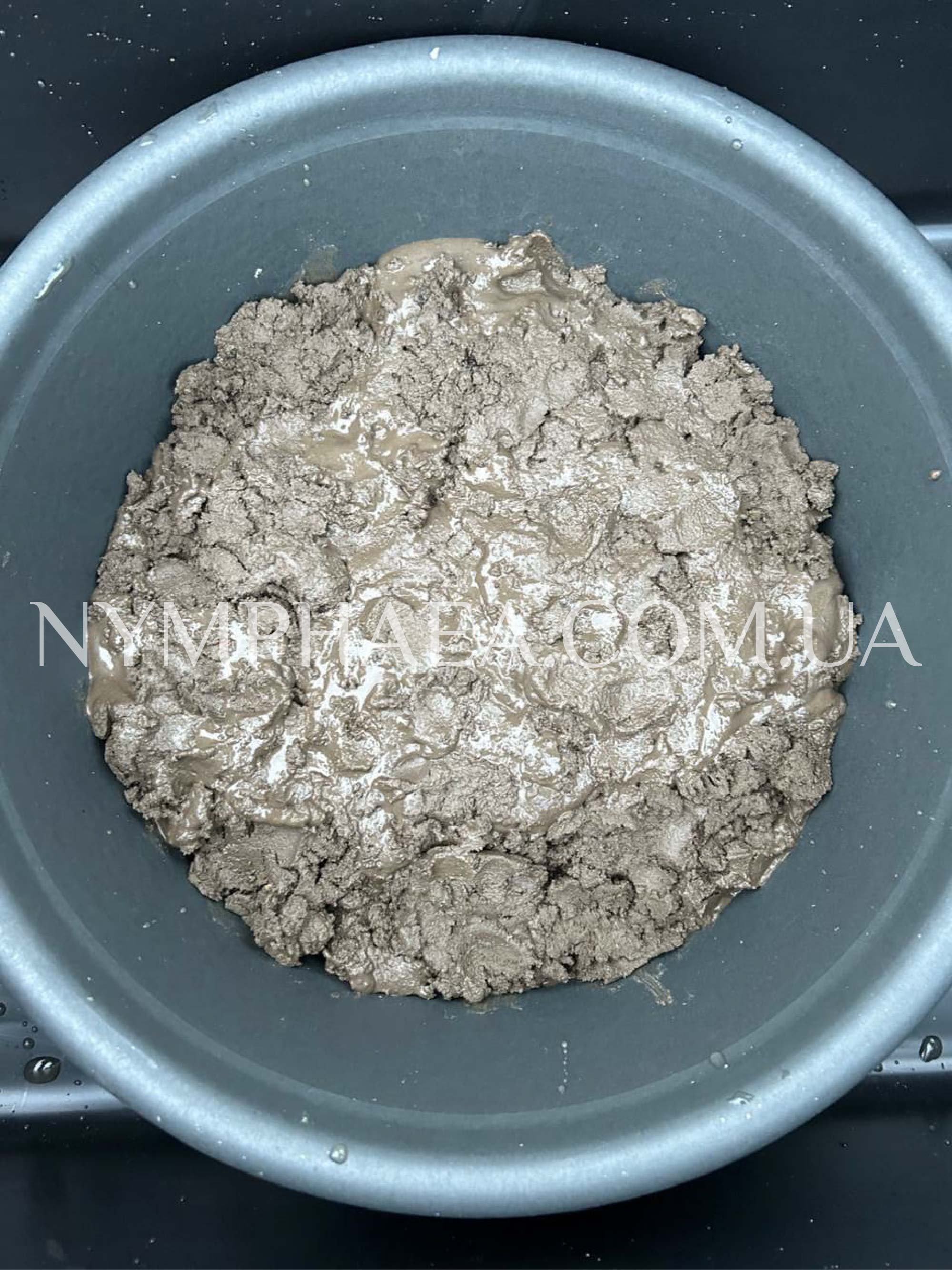 5. Дістаємо кущик німфеї із комом ґрунту з 2-х літрової ємності та кладемо його у вже підготовлену (за потреби, трошки вдавлюємо кущик у цей ґрунт, щоб кореневище було на рівні із краєм нової ємності). Розташовуємо кущик таким чином, щоб всім точкам росту було максимально багато місця для розвитку в усі сторони. Майже завжди достатньо буде просто притулити задню частину кому землі впритул до стінки більшої ємності, як показано на фото нижче;