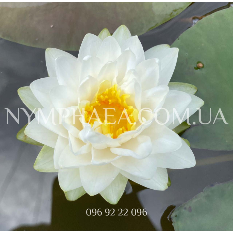 Цветок пионовидной формы (сферический), 10-12 сантиметров в диаметре, с ярко-жёлтой серединкой, которую иногда даже не видно из-за огромного количества белоснежных лепестков. Цветы обычно лежат на поверхности воды. Среднее количество лепестков – 57-62. Необильноцветущая.