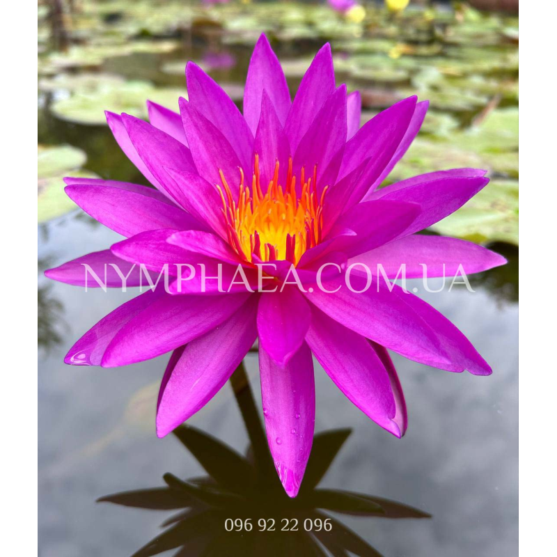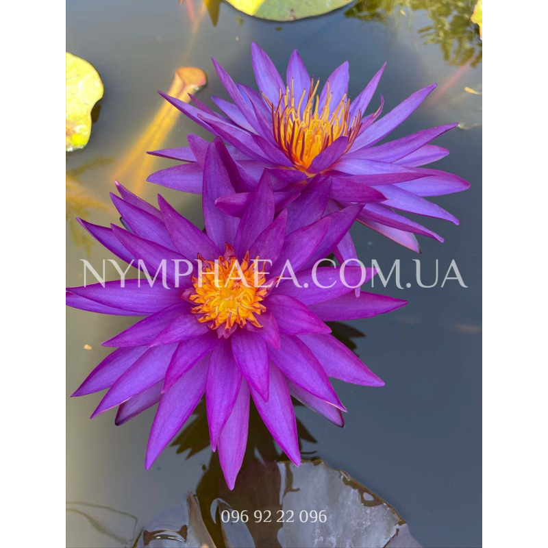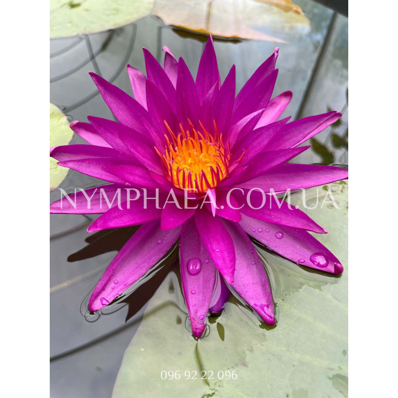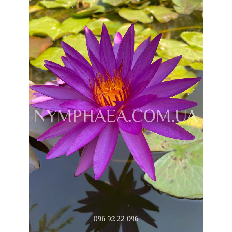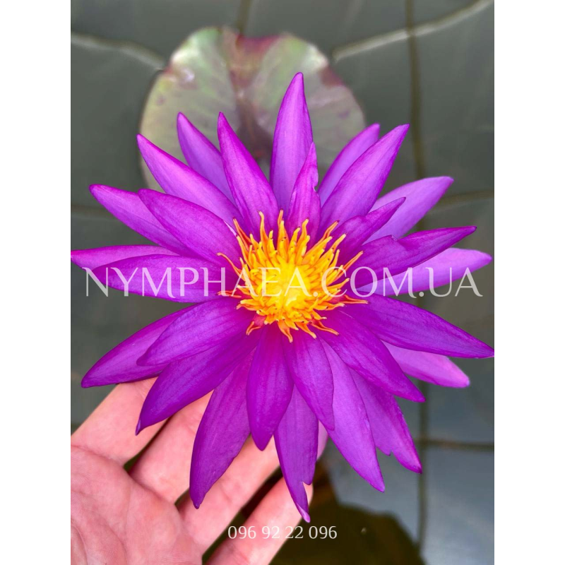 Цветок идеальной звёздчатой формы, диаметром приблизительно 15-25 сантиметров, лепестки узкие и вытянутые, цвет – интенсивно-фиолетовый. Цветёт очень и очень обильно, высоко поднимаясь над поверхностью воды. Абсолютно уникальный сорт! Невероятно красивая! Со временем становиться все более востребованной.