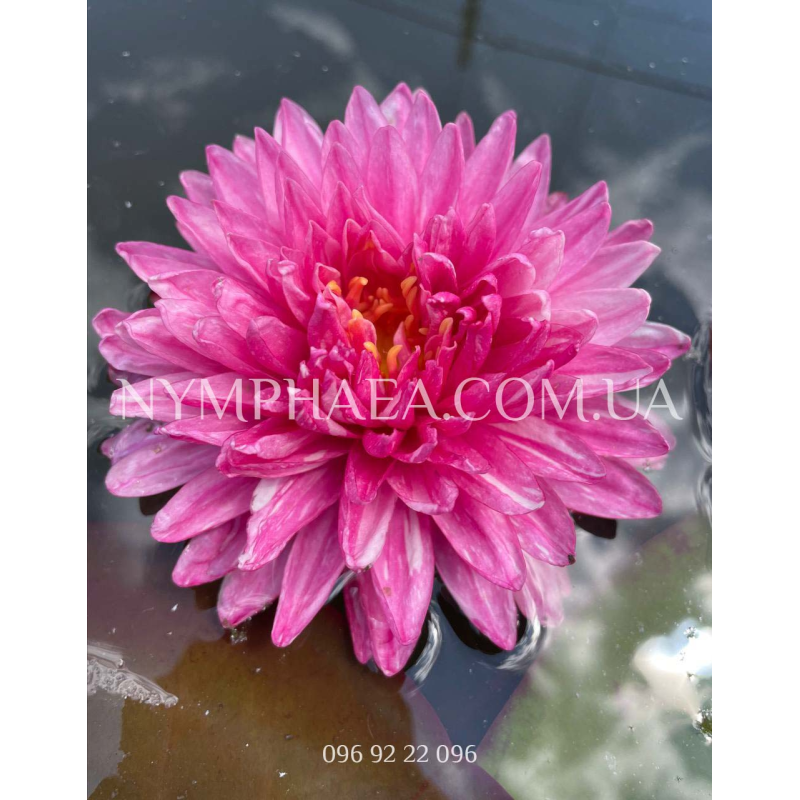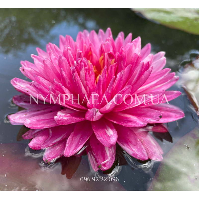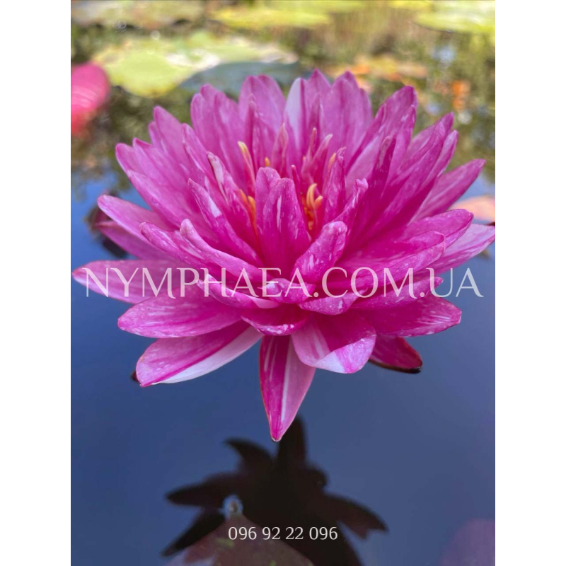 Эта нимфея без преувеличения – произведение искусства, цветок сорта Jakkaphong насыщенного ярко-розового цвета с различными белыми полосками и вкраплениями.