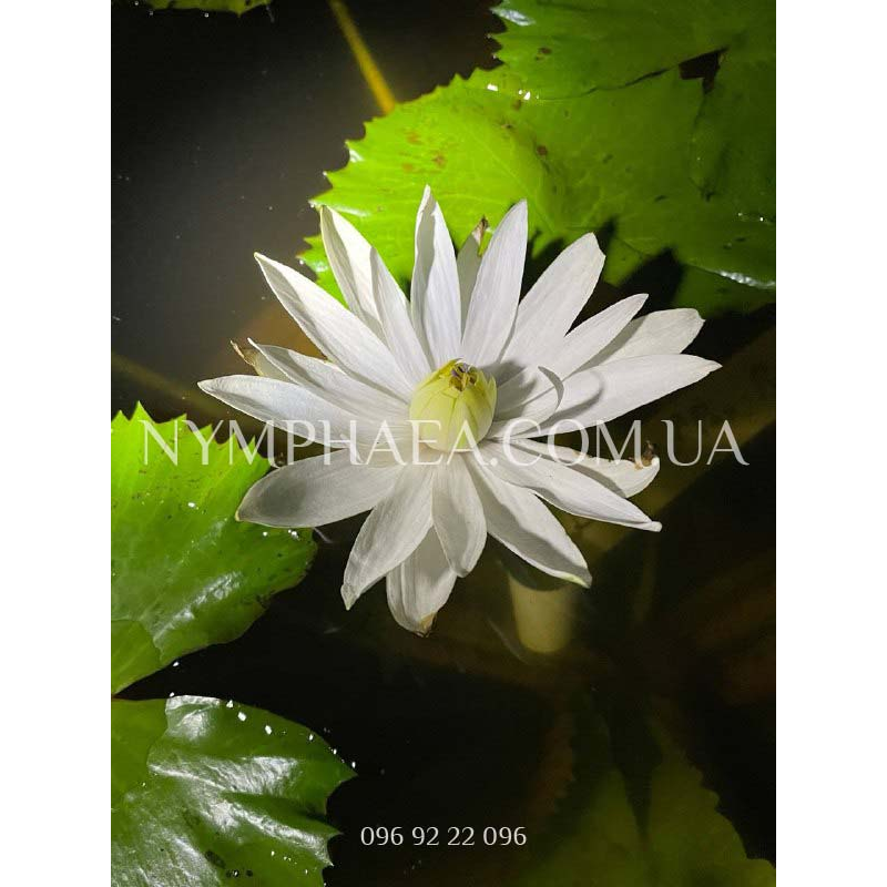 Цветы звёздчатой формы, нежного белого цвета с зеленоватым оттенком, особенно ближе к серединке. Цветёт довольно обильно, цветы поднимаются над поверхностью воды на 8-10 сантиметров.