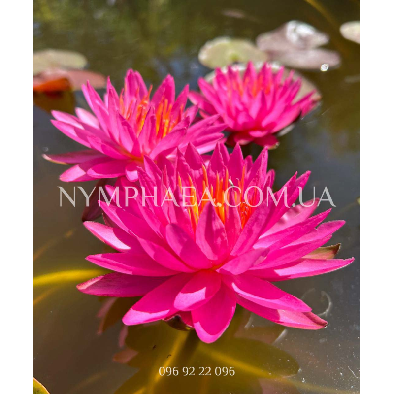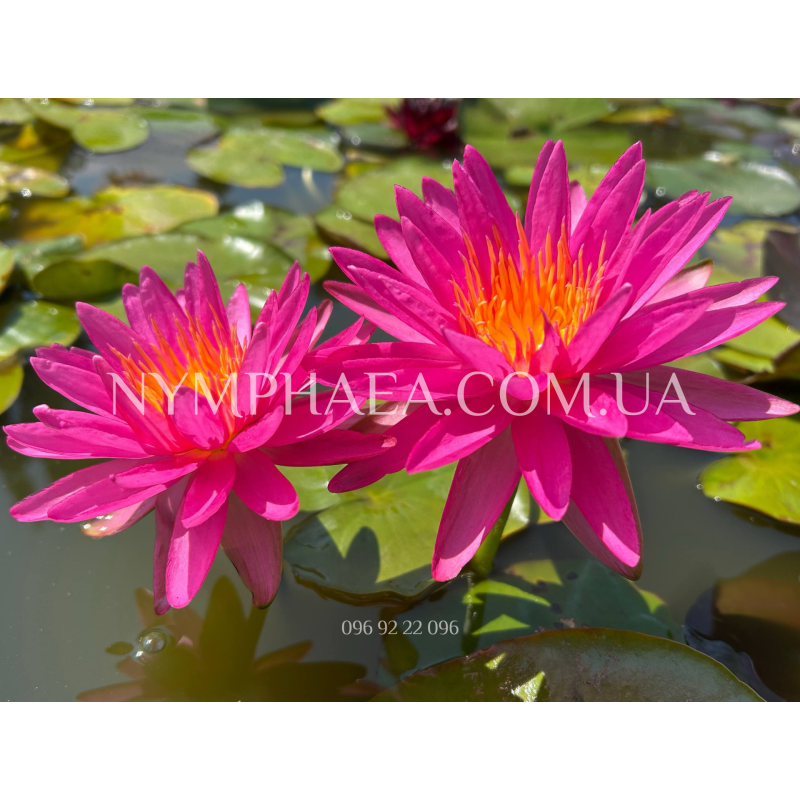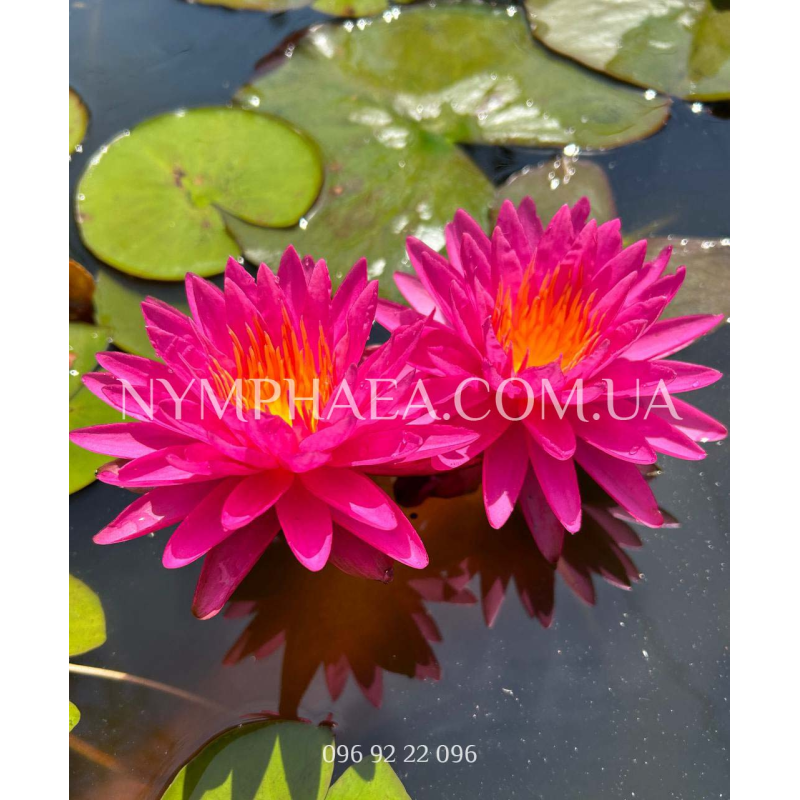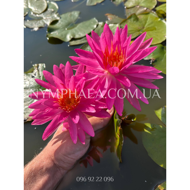 Цветы звездчатой формы, диаметр 15-24 сантиметра, с невероятными неоново-розовым окрасом и оранжевыми лепестками в центре. Абсолютно уникальный сорт с фантастическим цветом, который постоянно меняет свой оттенок в зависимости от количества удобрений, солнечного света и температуры воды. В пасмурную погоду цветы как будто стеклянные и светятся (это очень сложно объяснить, выглядит невероятно).