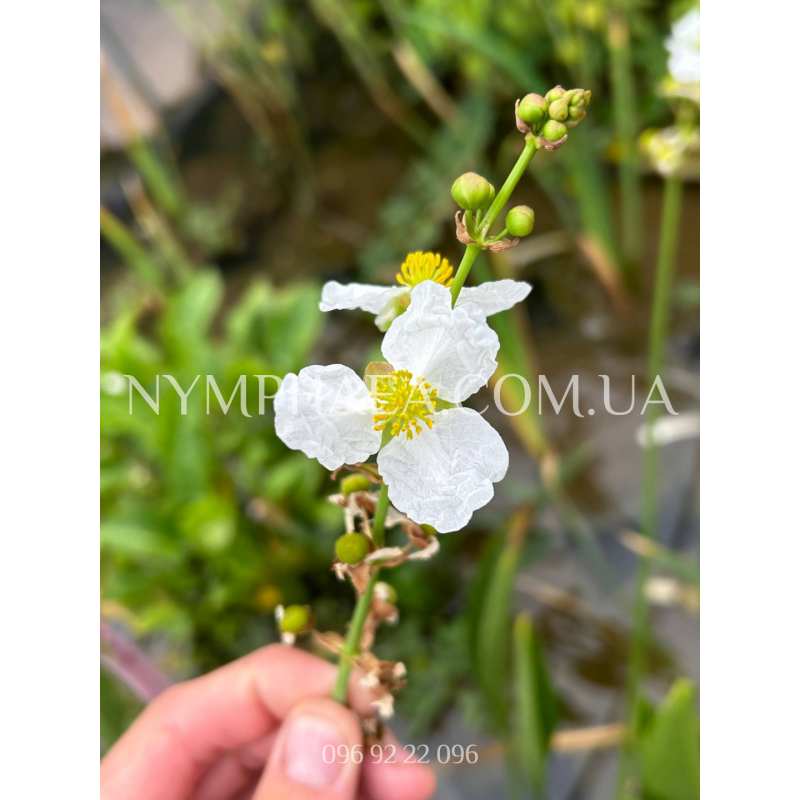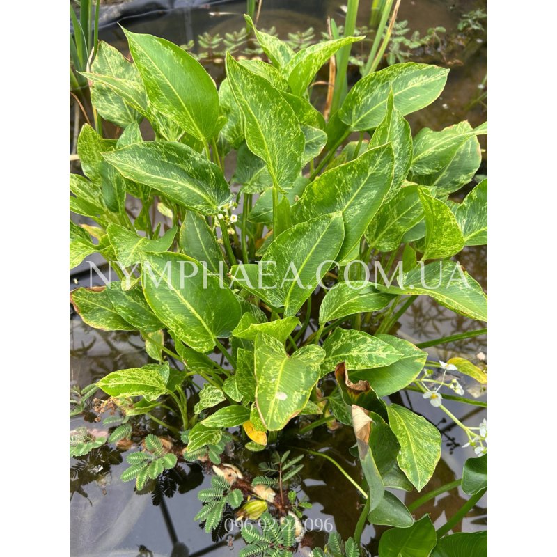 При хорошем освещении белые прожилки становятся особенно выразительными, а в полутени листва приобретает более мягкий, нежно-зелёный, а белые части могут стать немного желтоватыми, что тоже очень красиво смотрится. Цветёт Sagittaria ‘Crushed Ice’ с начала лета до осени, выпуская высокие стрелки с небольшими белыми цветками, контрастирующими с пестрой листвой. Цветение не основная, но приятная декоративная особенность этого сорта.