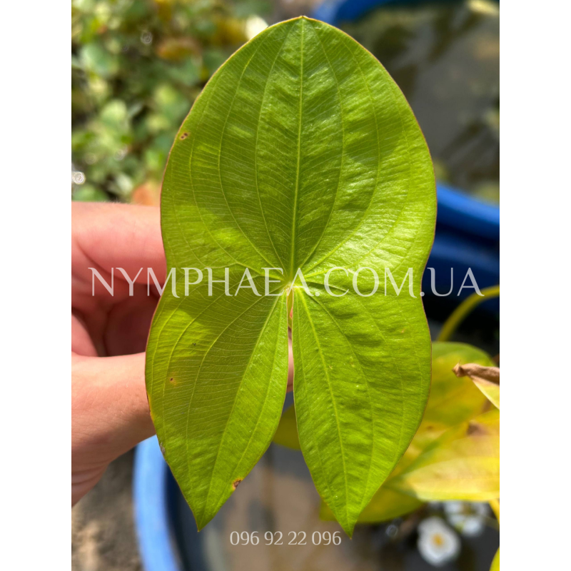 Листья крупные, ярко-зелёные, очень выраженной стреловидной формы, поднимаются над водой. Не агрессивна, но в хороших условиях довольно быстро растёт, кусты довольно компактные, очень декоративно смотрятся. На протяжении всего сезона (начиная с конца мая) начинает активно давать множество цветоносов, сами по себе цветы довольно мелкие и невзрачные, но благодаря тому, что растение быстро растущее и обильноцветущее, то множество цветоносов в разгар сезона выглядят очень нежно и красиво. Цветы мелкие, с розовым оттенком и огромным ярко-желтым центром.